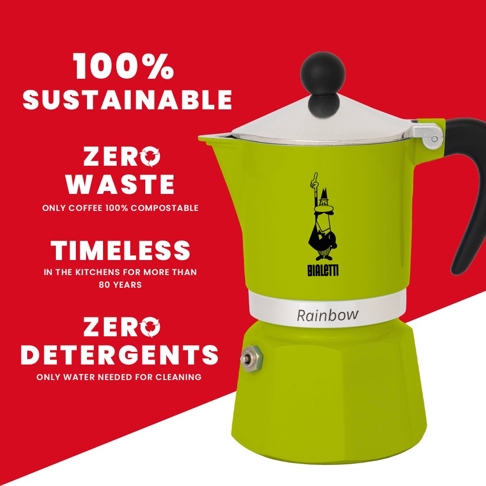 Bialetti Rainbow je dizajnová talianska moka kanvička kombinujúca oblý tvar zásobníka s oktagonálnym podstavcom. Hliníkové telo dopĺňa elegantne tvarovaná rukoväť a originálny okrúhly úchyt, ktorý prepožičiava veku kanvičky roztomilý vzhľad čiapky s brmbolcom; rukoväť aj úchyt sú tiež zhotovené zo špeciálneho tepelne odolného materiálu polyamidu 66, ktorého unikátne žiaruvzdorné vlastnosti eliminujú možnosť popálenia. Moka kanvičky série Rainbow prichádzajú v krásnych dúhových farbách a disponujú tiež špeciálnymi patentovanými ventilmi Bialetti pre ľahké čistenie a bezpečnosť procesu vysokotlakového ohrevu.