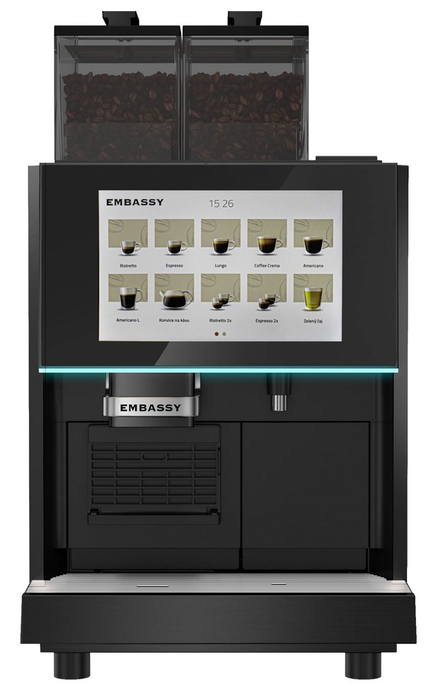 Moderný 10" dotykový displej s českou lokalizáciou umožňuje jednoduché a intuitívne ovládanie. K dispozícii je 30 prednastavených receptov, z ktorých každý možno individuálne prispôsobiť úpravou teploty, dávkovania alebo poradia zložiek. Embassy Bogota II je ideálnou voľbou pre hotely, veľké kancelárie, čerpacie stanice a kaviarne.