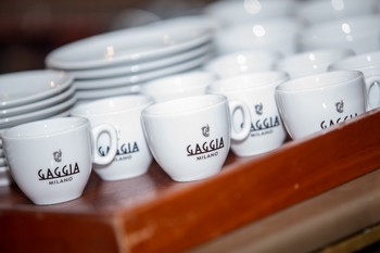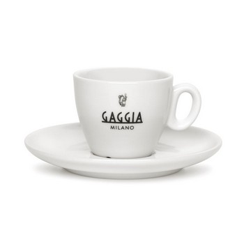 Šestice stylových černobílých šálků s podšálky zdobených logem Gaggia.