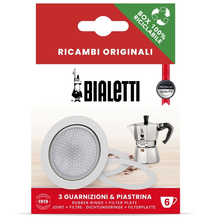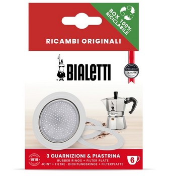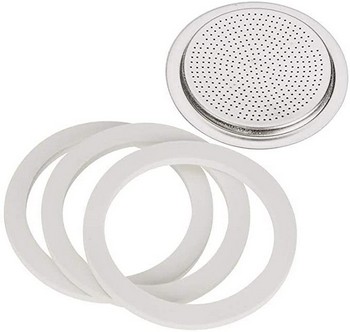Náhradné tesnenie a filter pre moka kanvičky Bialetti Moka Express. Ide o originálne náhradné diely Bialetti. Tesnenie je kompatibilné aj s modelmi Dama a Fiammetta s rovnakým objemom. Súprava obsahuje tri tesniace krúžky a jeden filter.