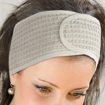 Kozmetická čelenka vyrobená z vaflového materiálu s bavlnenou lemovkou.